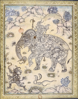 Éléphant composite monté par un génie à tête de bouquetin,